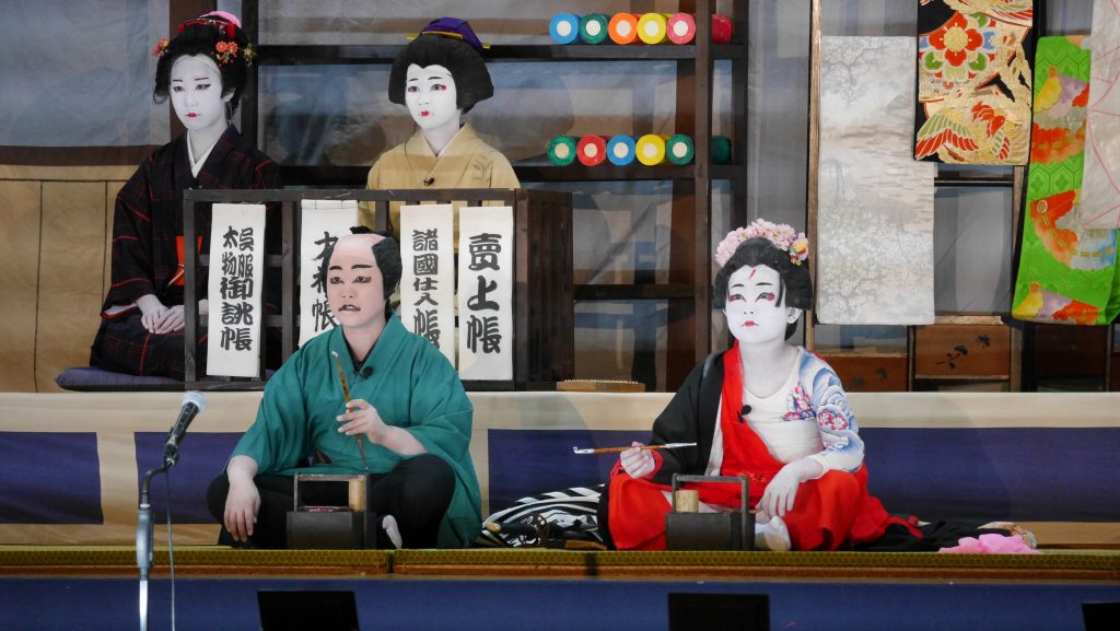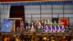 11月30日、高屋東小学校体育館で白市歌舞伎が上演されました。演目は、「白浪五人男」。この演目の「稲瀬川(いなせがわ)勢揃いの場」を大人、「浜松屋店先の場」を小、中学生が演じました。会場には子どもからお年寄りまでつめかけ、大盛況。子どもたちの熱演におひねりも飛び交いました。